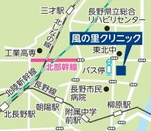 周辺地図 お車でお越しの方国道19号「柳原駅西」を北へ向かい、市民病院東交差点を直進▪長野電鉄をご利用の方「柳原駅」下車徒歩20分▪東北ぐるりん号をご利用の方「富竹の里入口」下車徒歩1分 ▪長電 三才線・浅川西条線・檀田三才線ご利用の方 東北中学校」下車徒歩4分